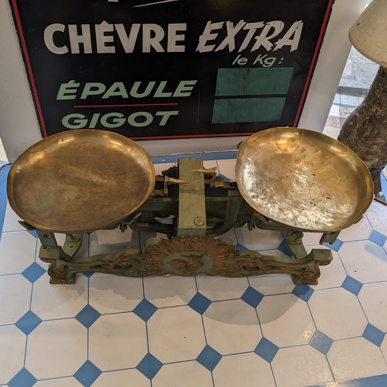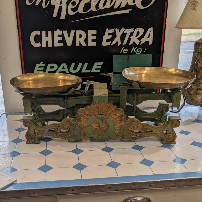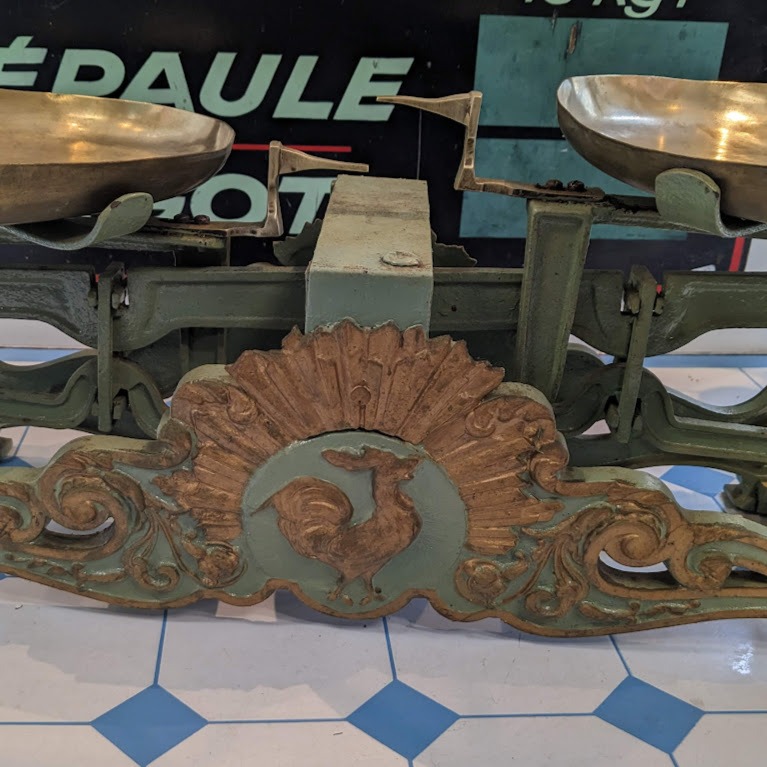 Ancienne balance de magasin en fonte de fer figurant sur chaque face un coq.