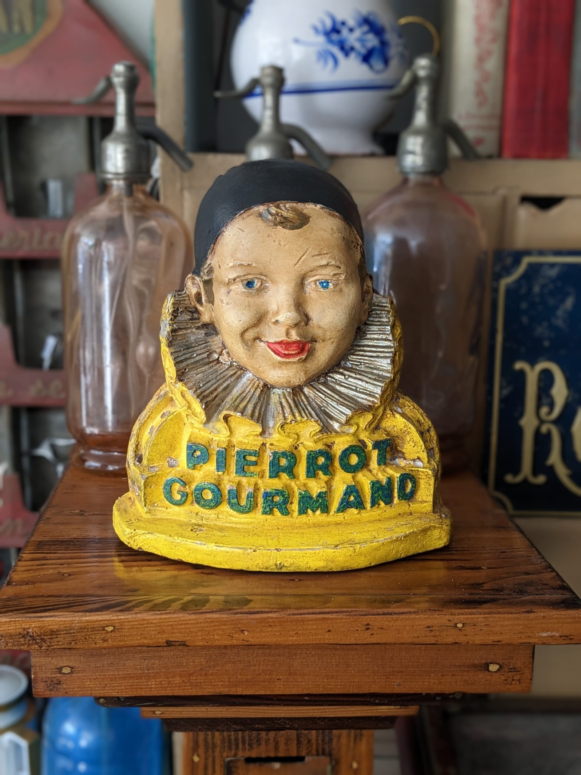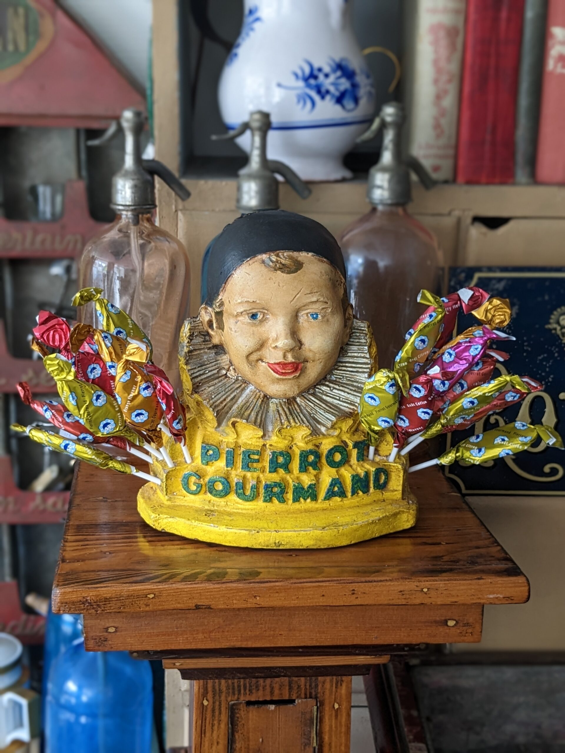 Joli et rare présentoir à sucettes Pierrot Gourmand des années 50.