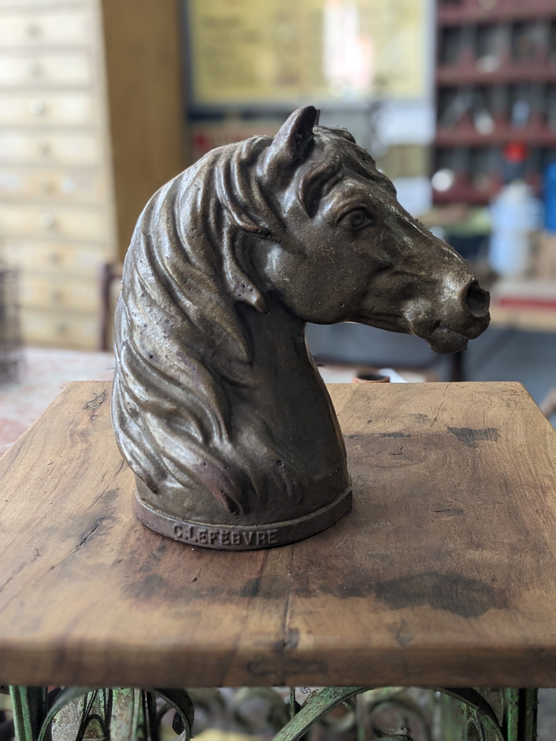 Ancienne tête de cheval en fonte de fer marquée sur la tranche C.LEFEBVRE. Fin XIXème début XXème.