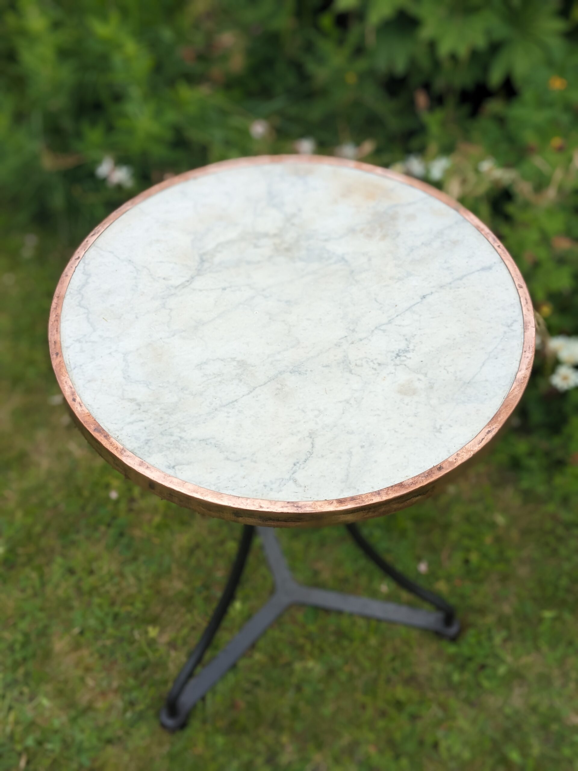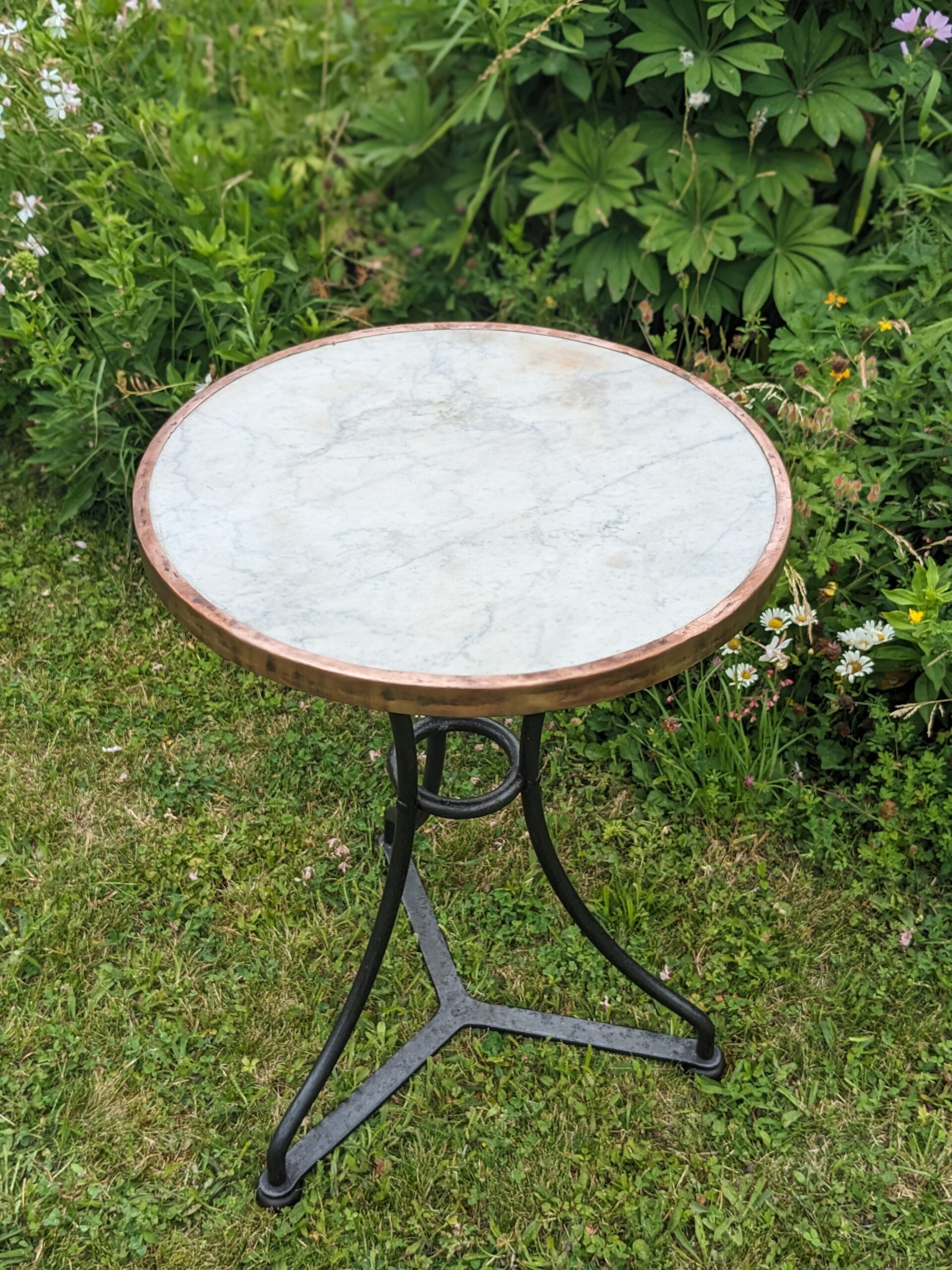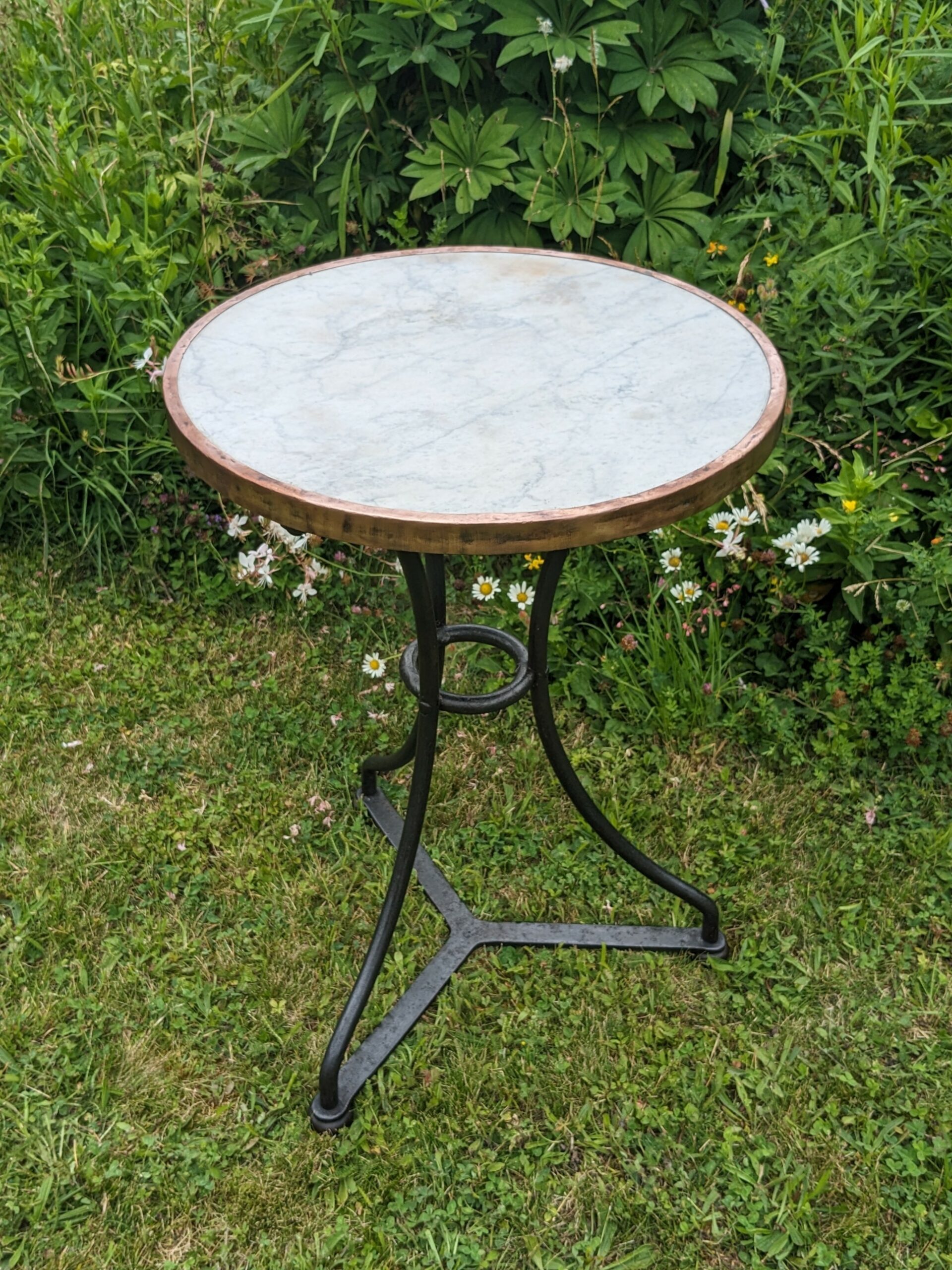 Ancien guéridon de bistrot début XXème, plateau marbre, bordure en laiton et piètement en fonte. Très bel état.