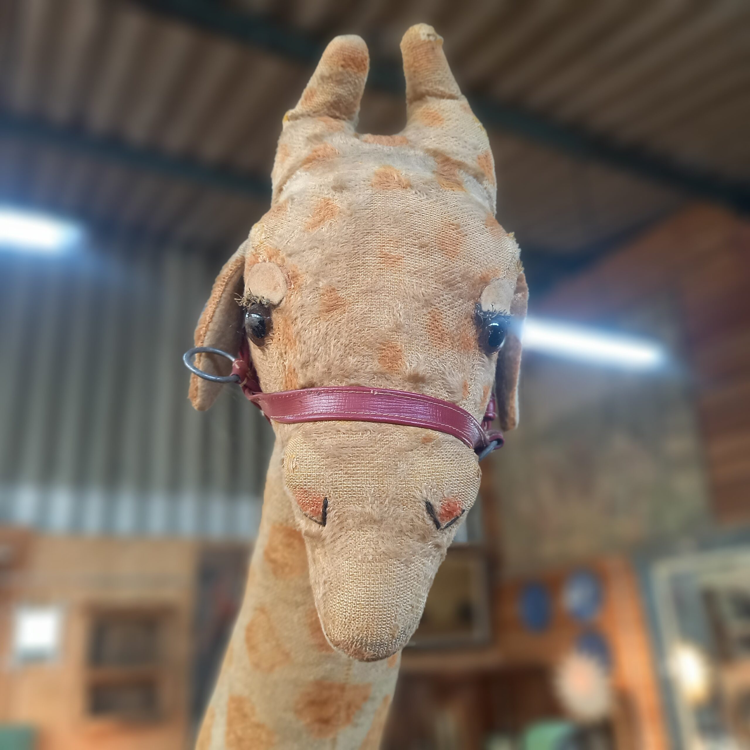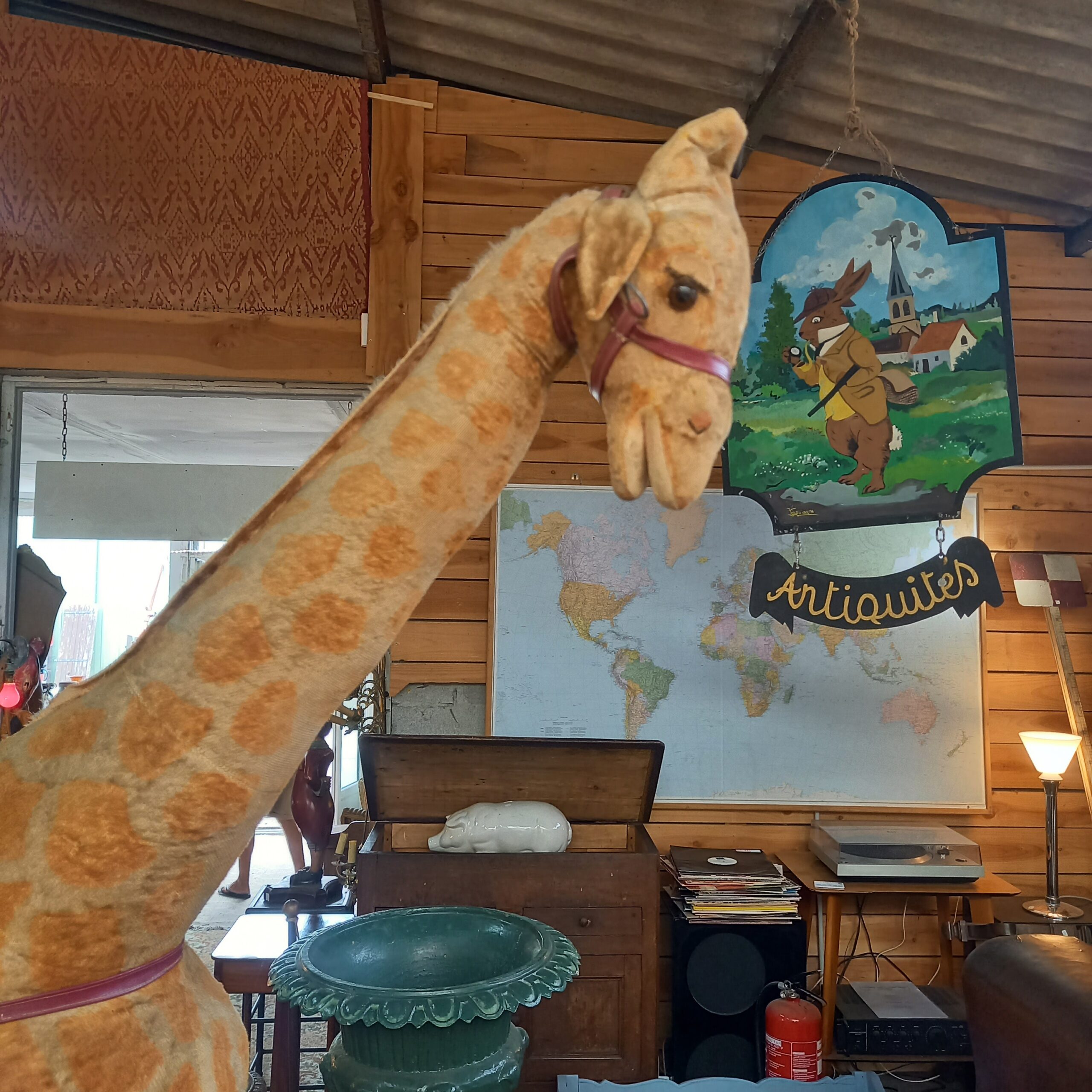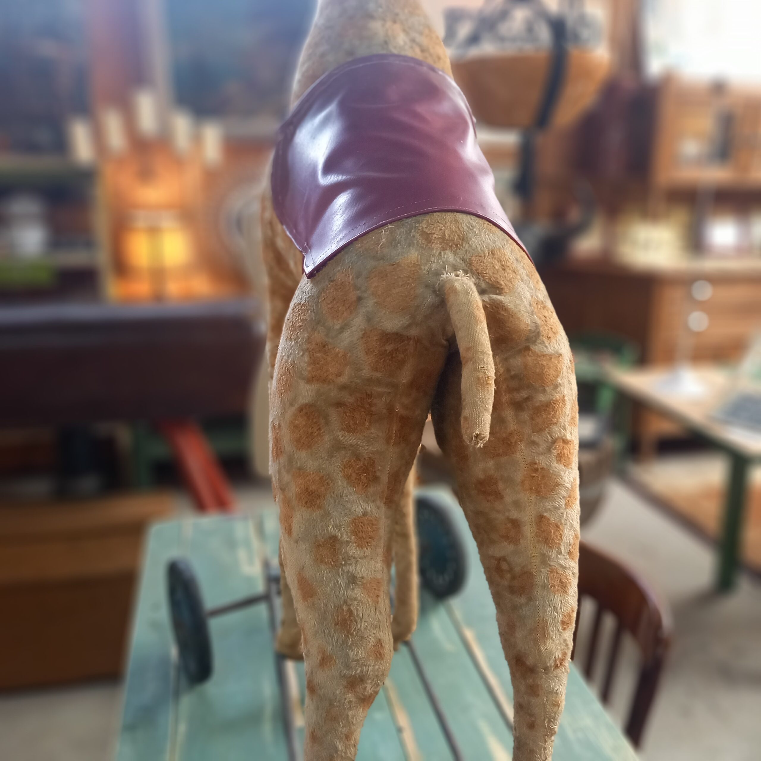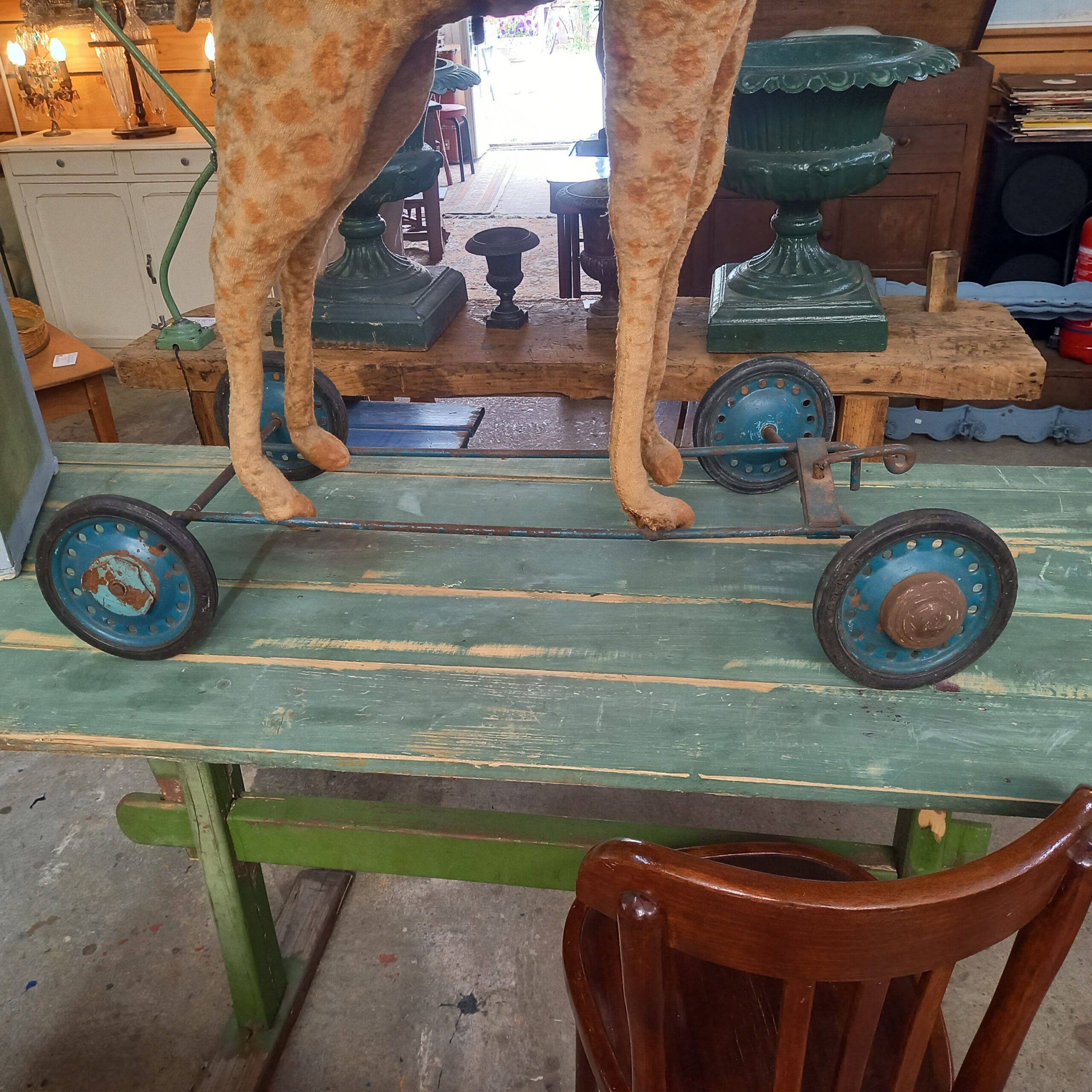 Ancien jouet, très grande girafe sur roulettes en tissus et paille année 40