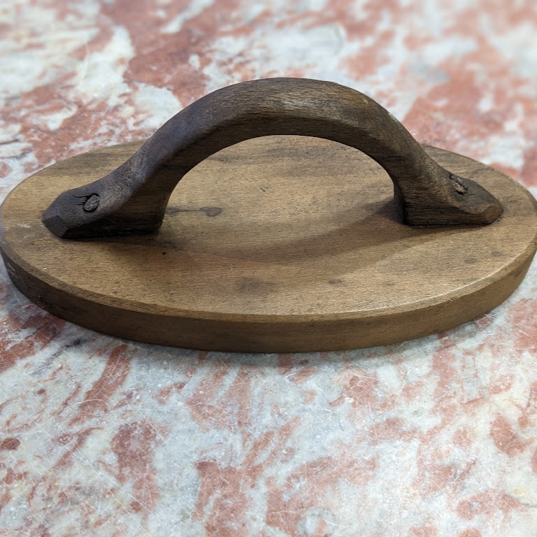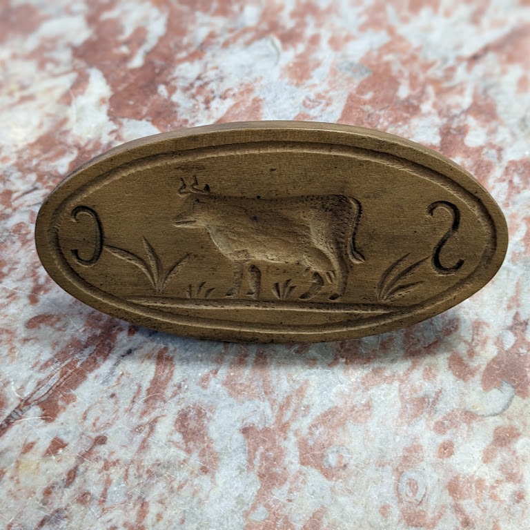 Ancienne matrice en bois pour marquer le beurre figurant une vache dans un pâturage. Marquée des initiales » SC ». Bel objet d’art populaire.