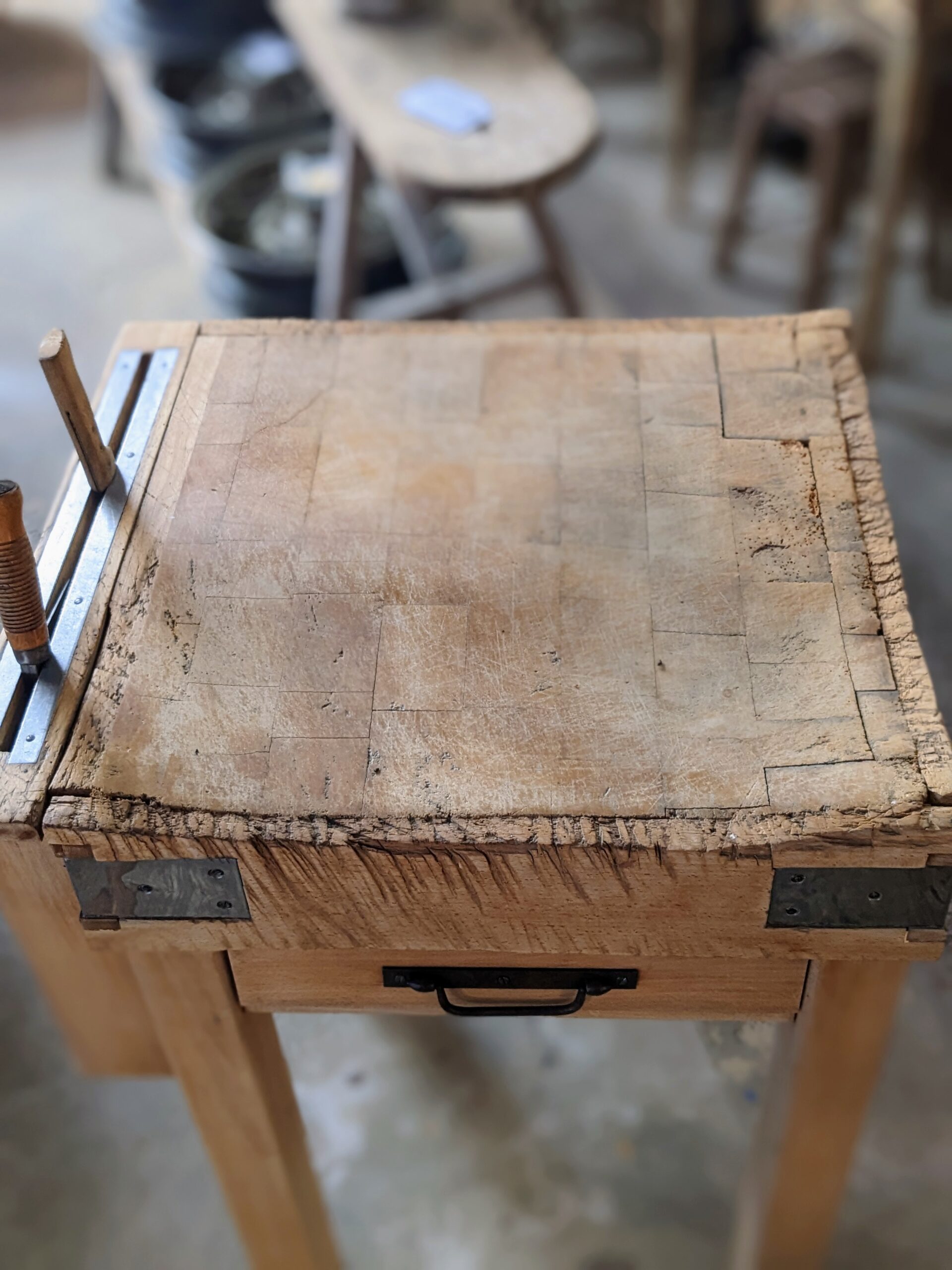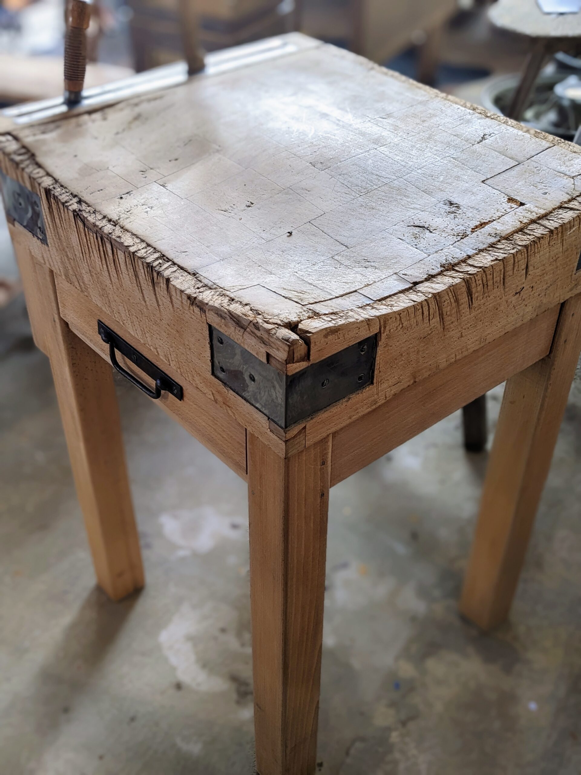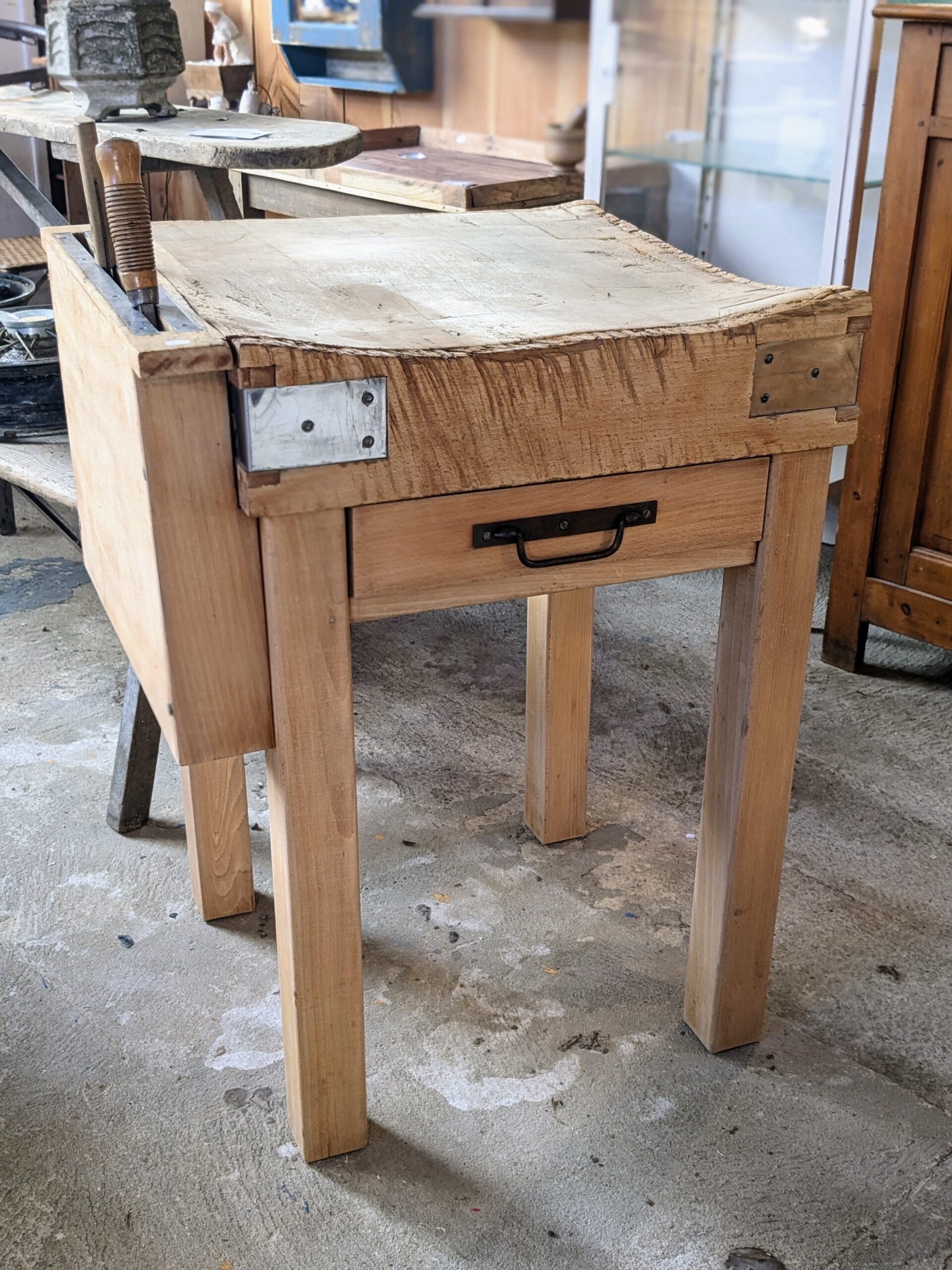 Billot de boucher en bel état avec range couteau et fusil sur le côté.