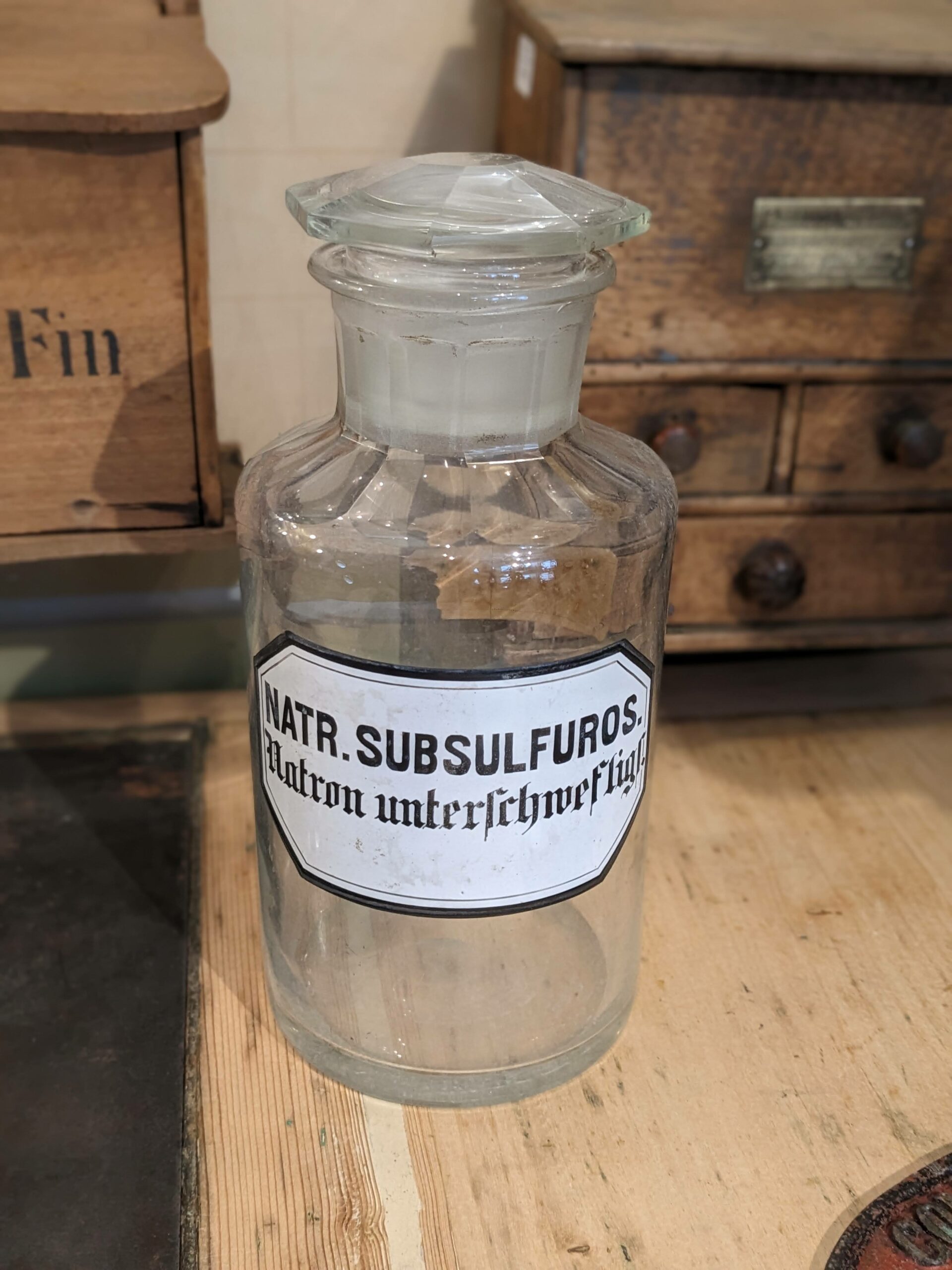 Ancien flacon de pharmacie XIXème avec son cartouche émaillé écrit en latin