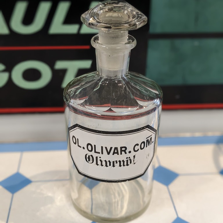 Ancien flacon de pharmacie XIXème avec son cartouche émaillé écrit en latin