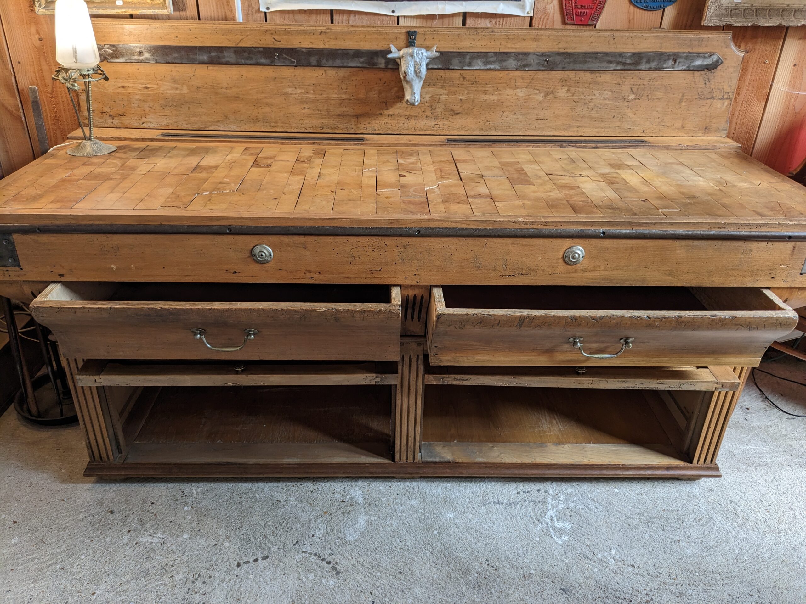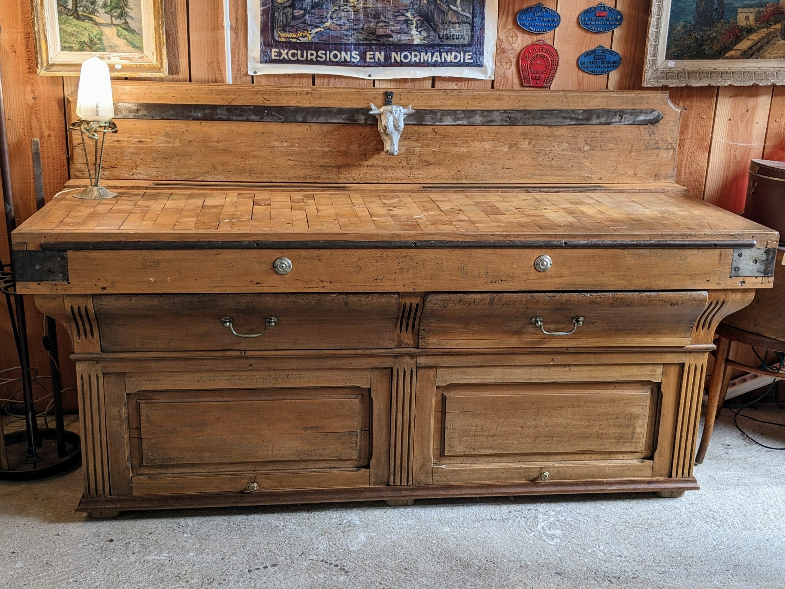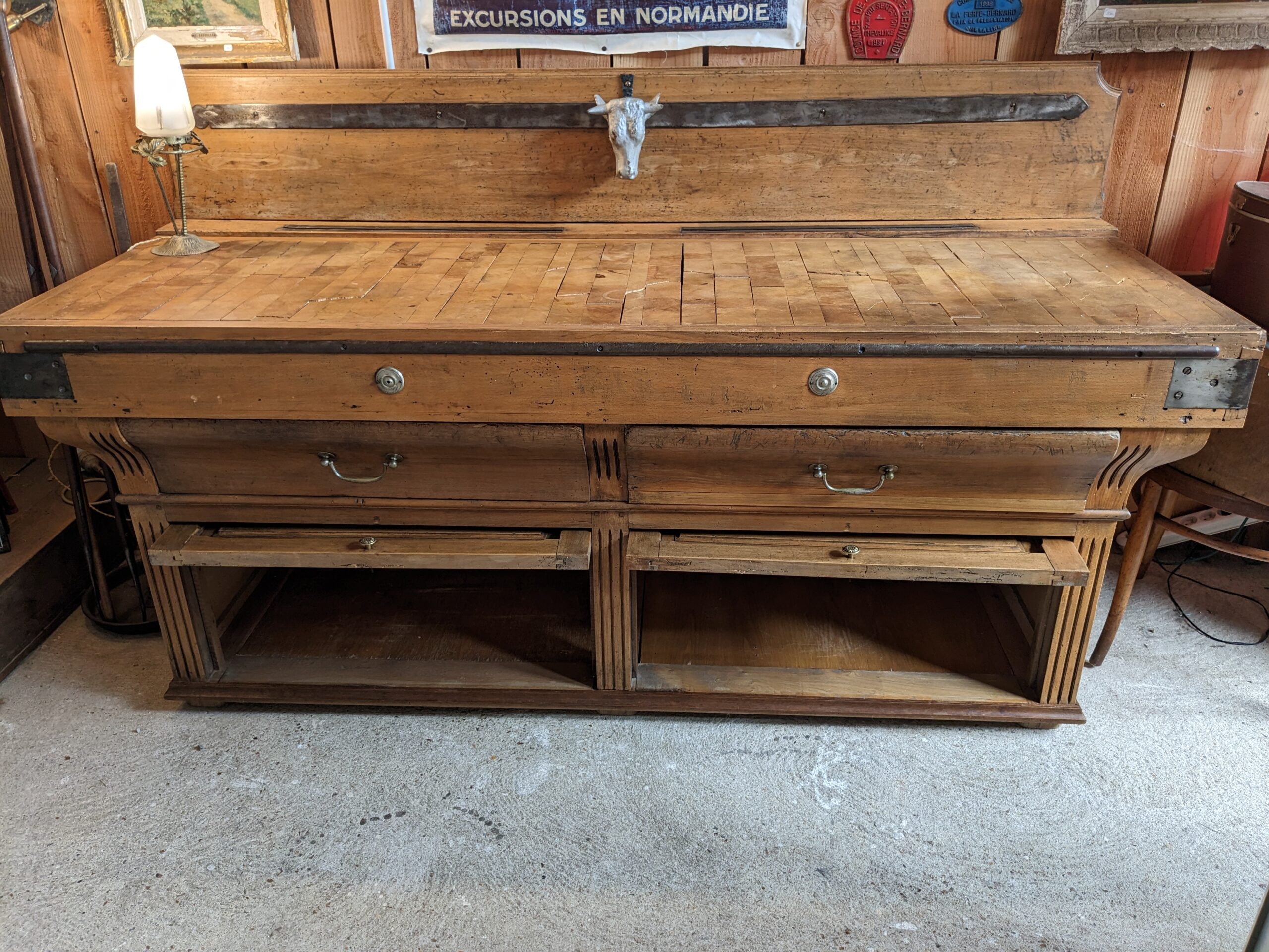 Imposant billot de boucherie avec étal à soubassement, 4 tiroirs.