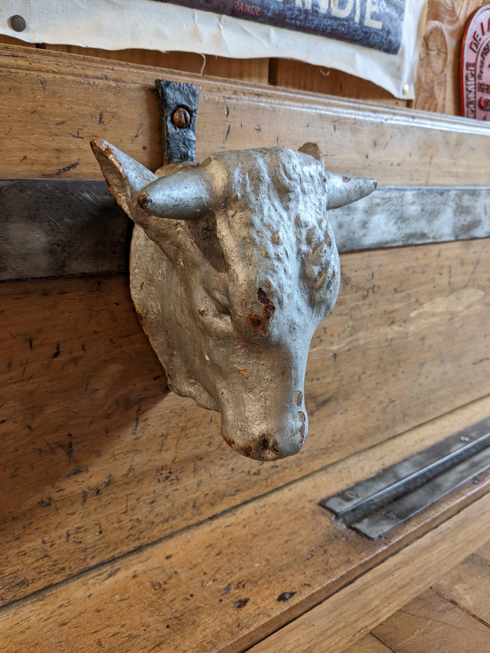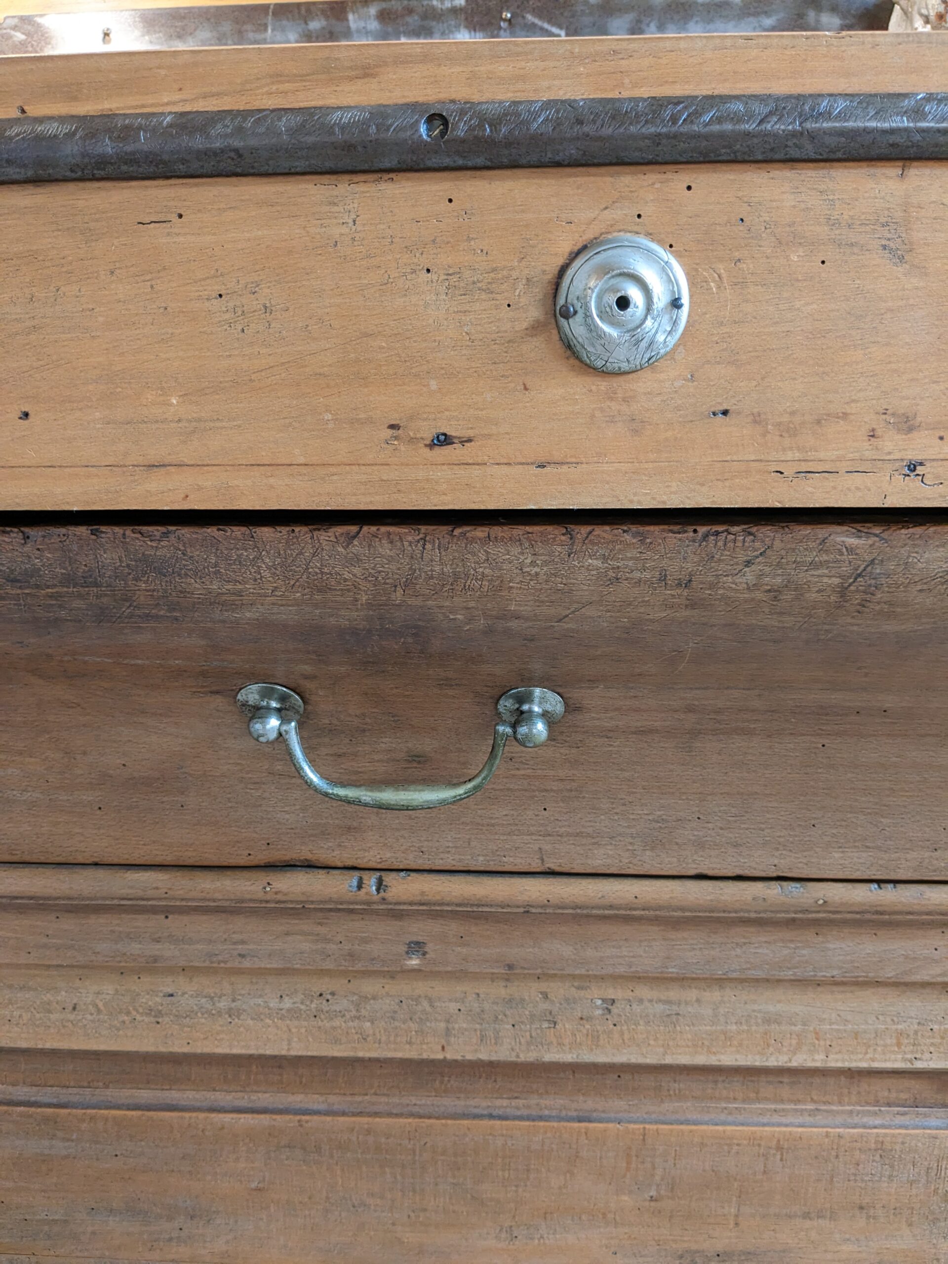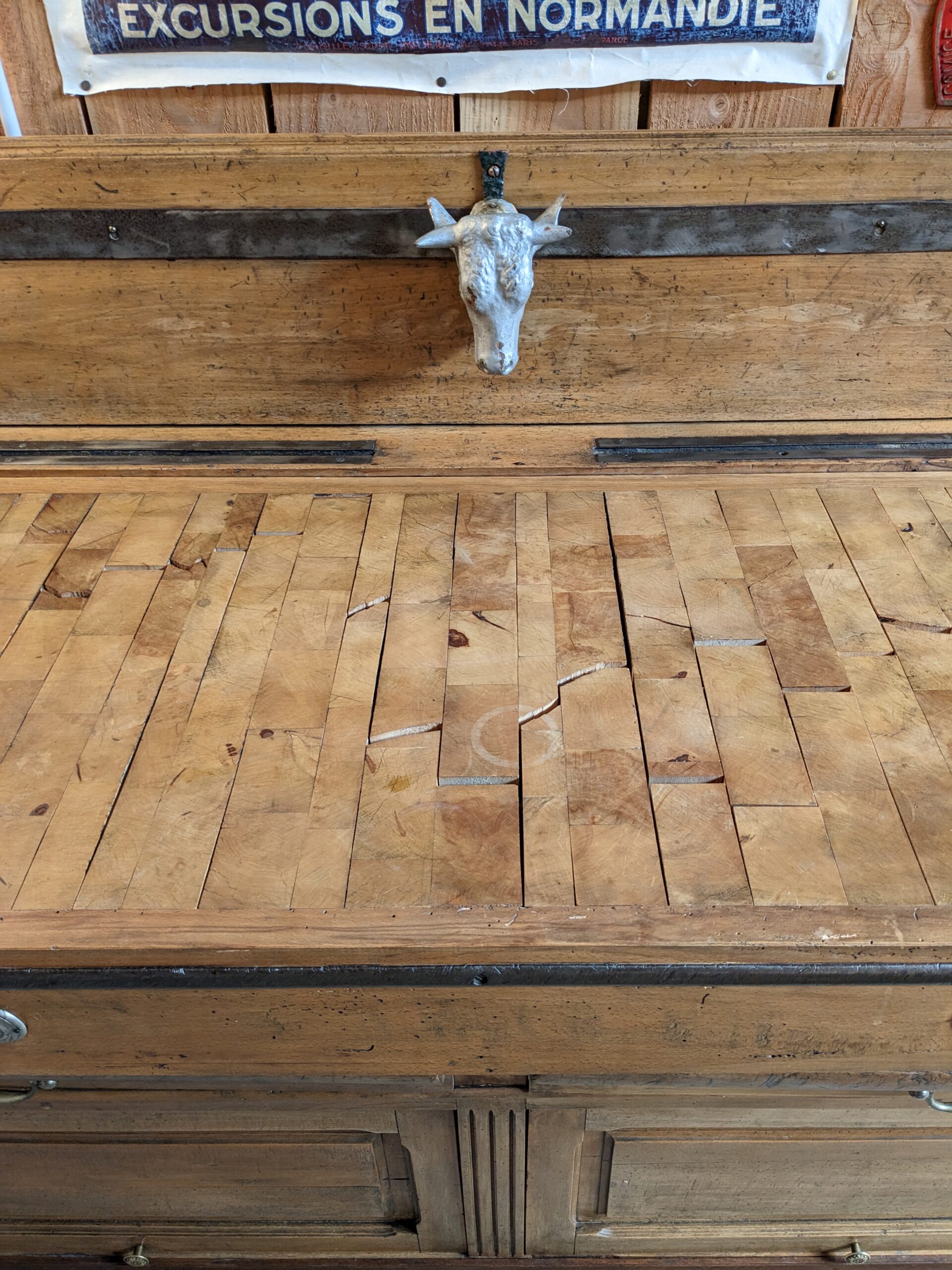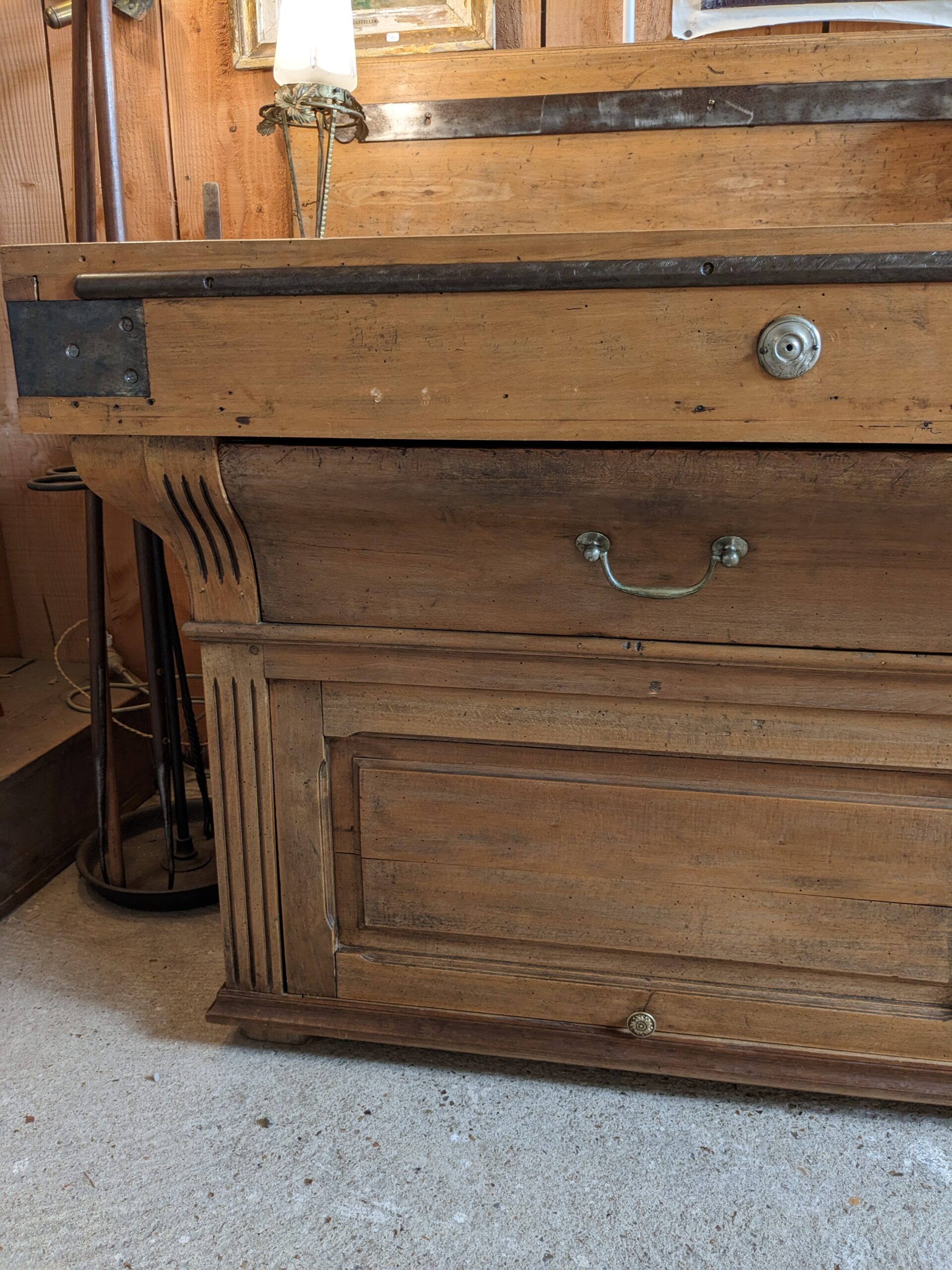 Imposant billot de boucherie avec étal à soubassement, 4 tiroirs.