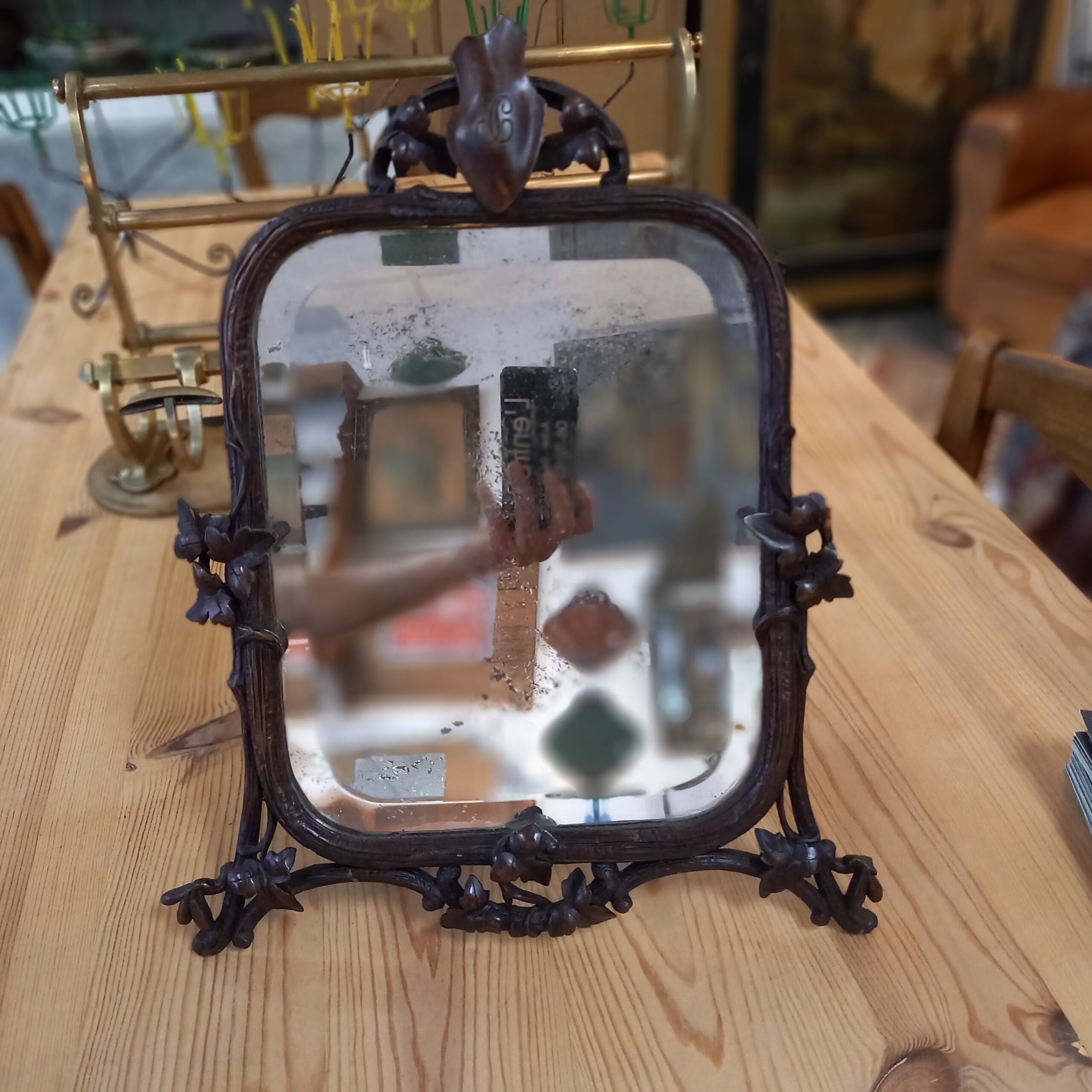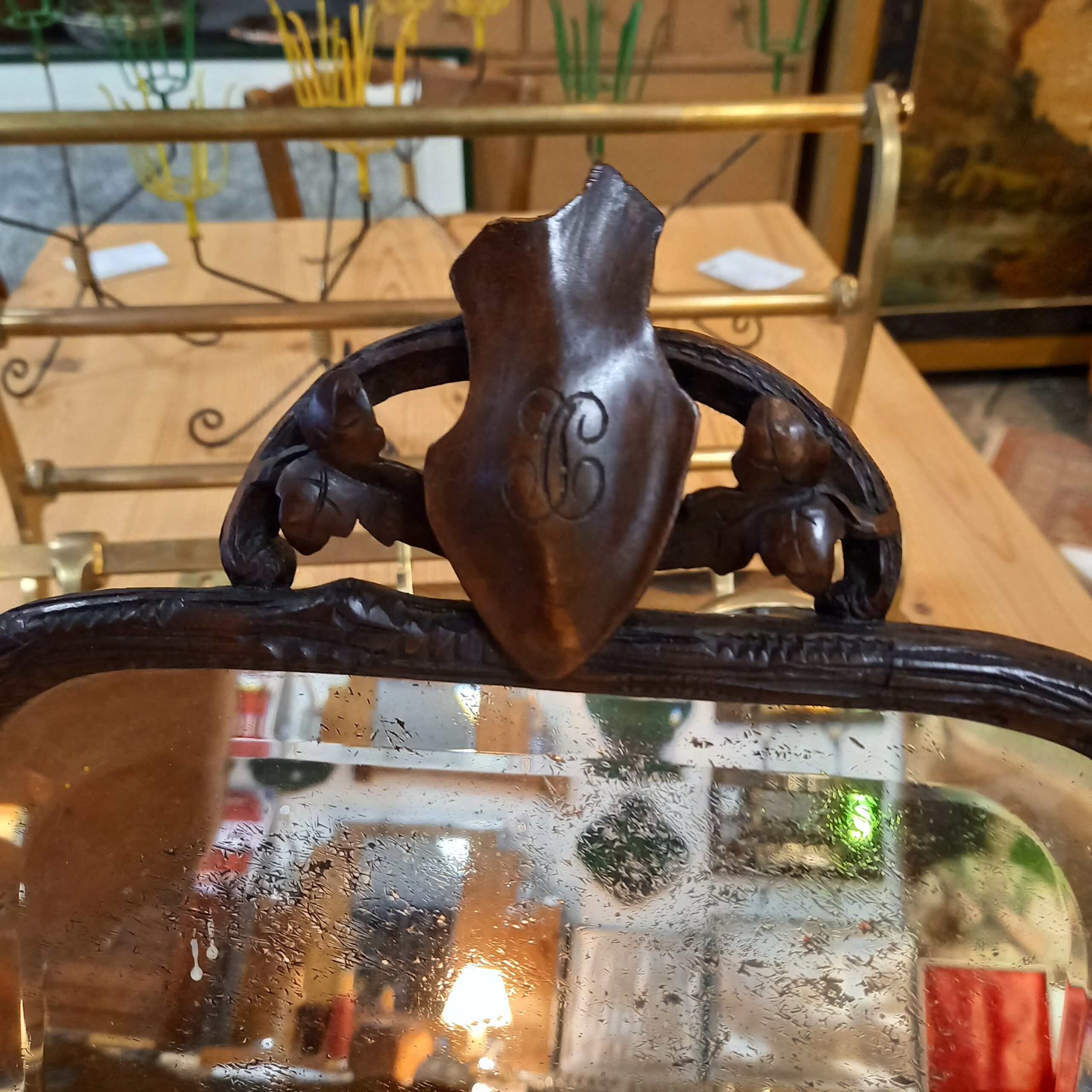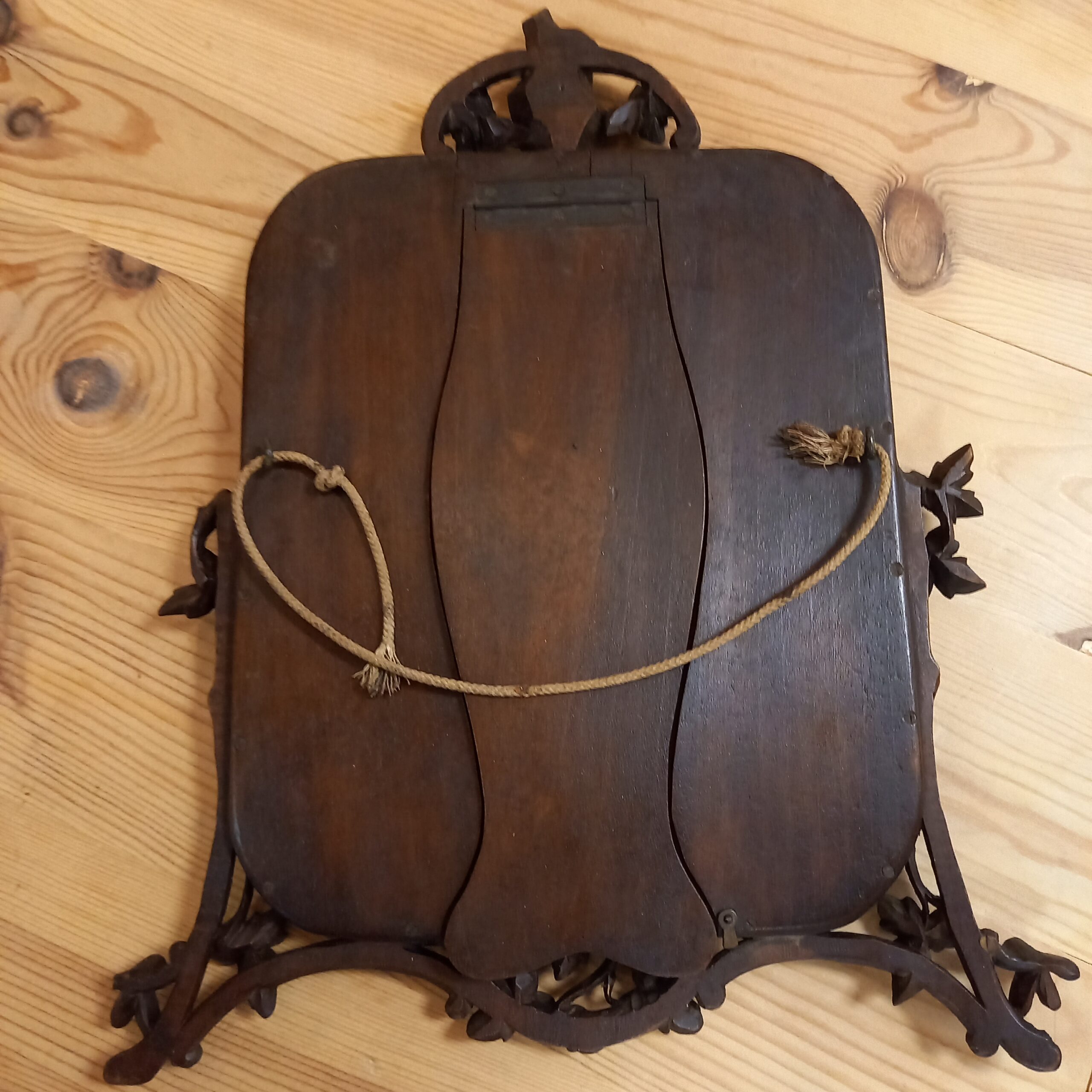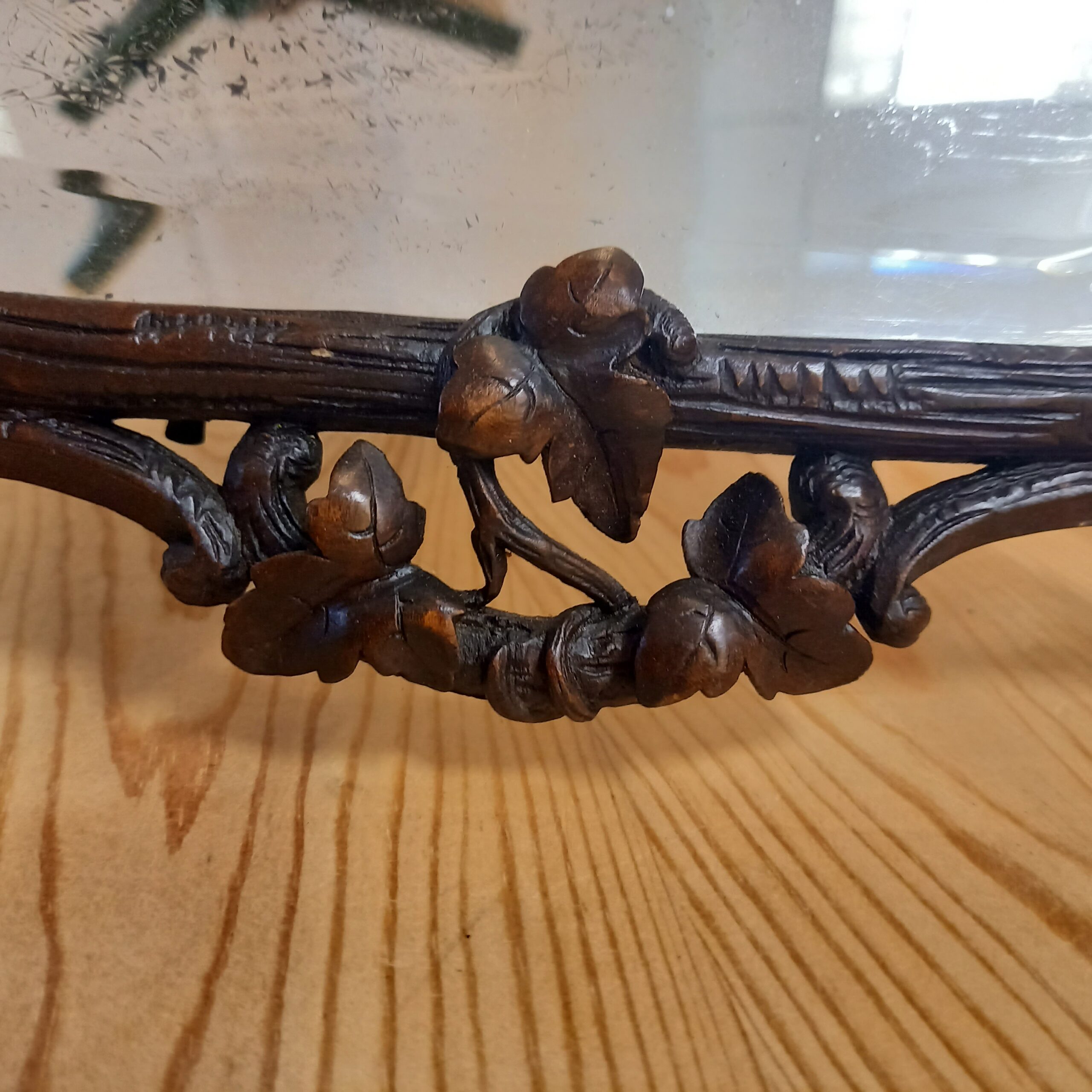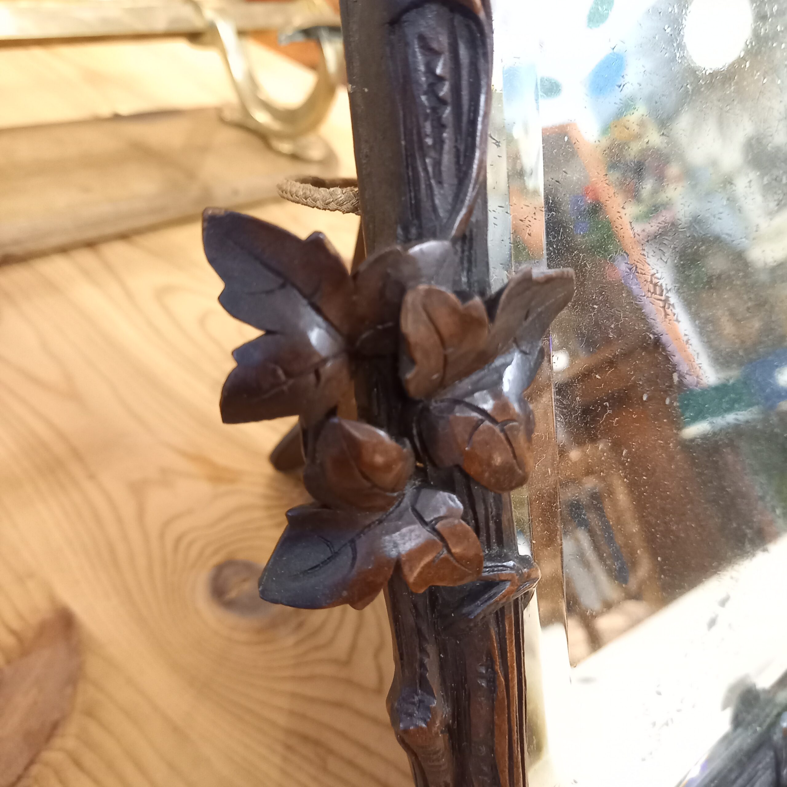 Miroir XIXème avec cadre en bois finement sculptée décors type Forêt Noire et glace biseautée d’époque. Très belle état.