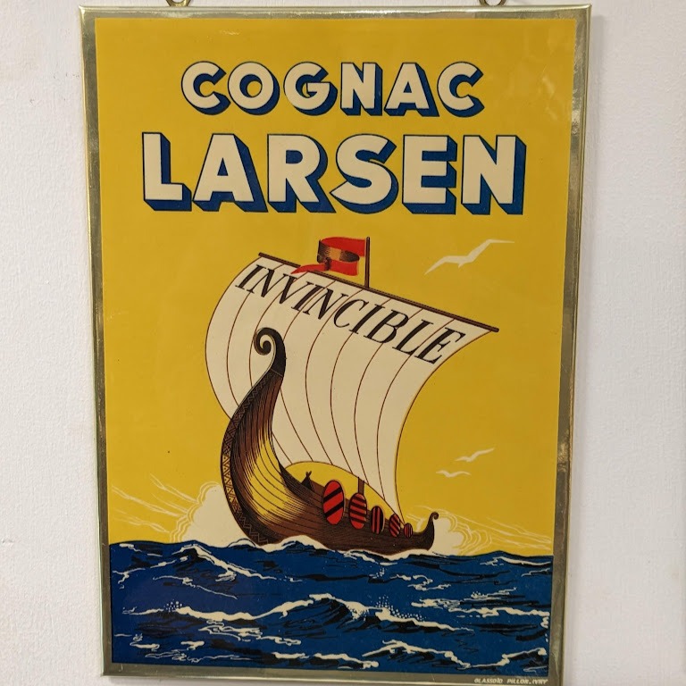 Ancienne plaque publicitaire en glacoïde des années 1960 pour la marque de Cognac Larsen.