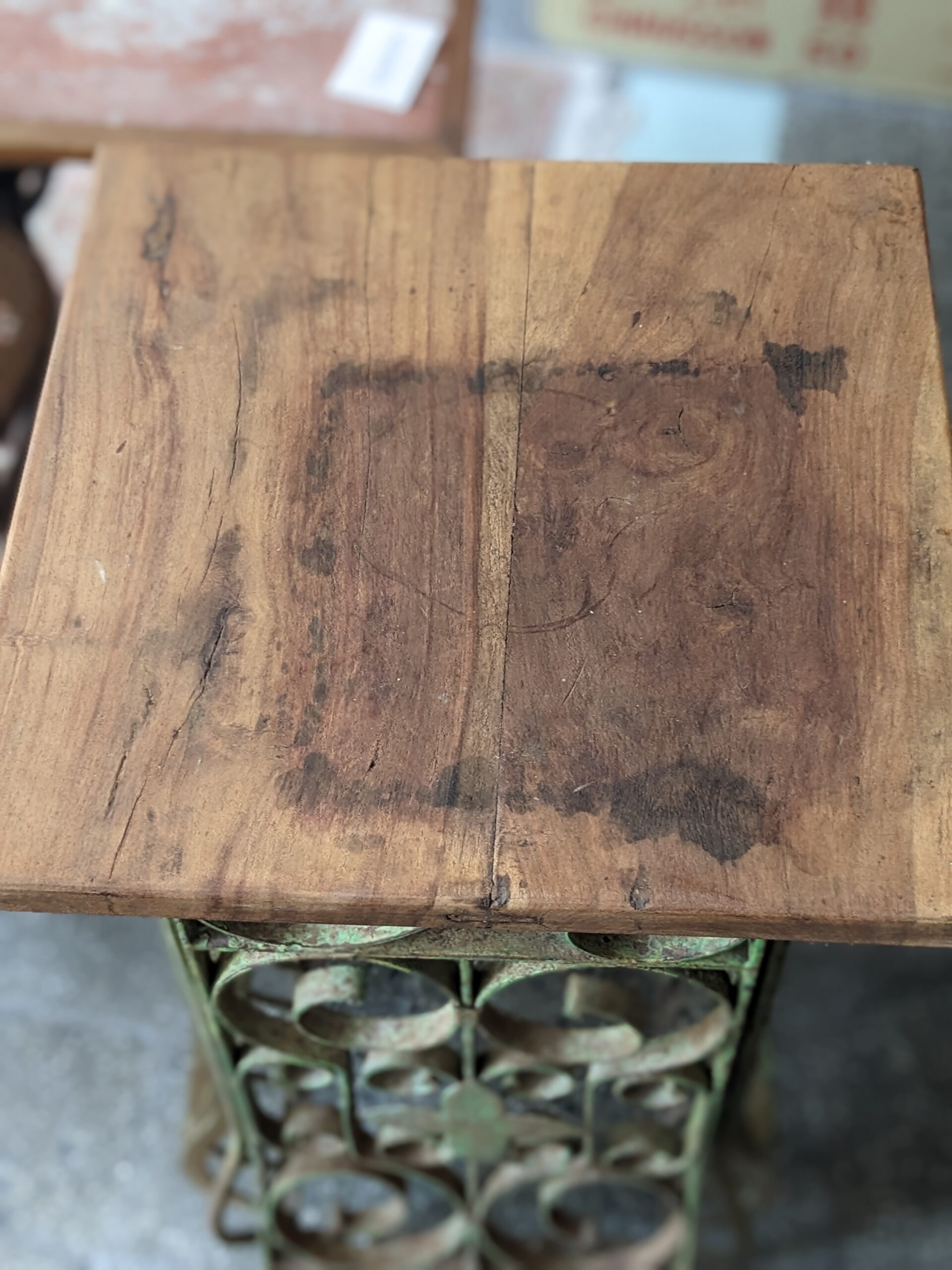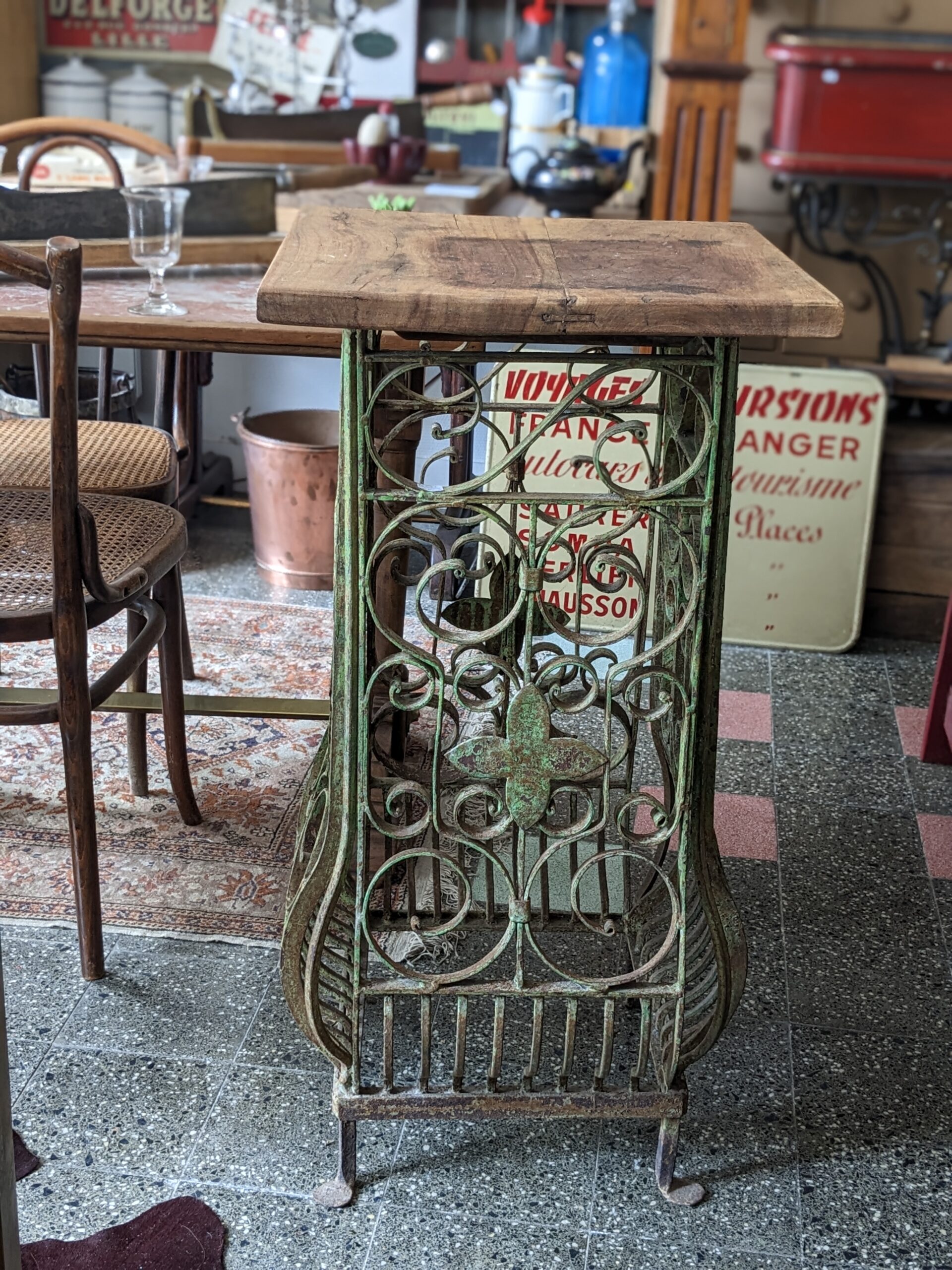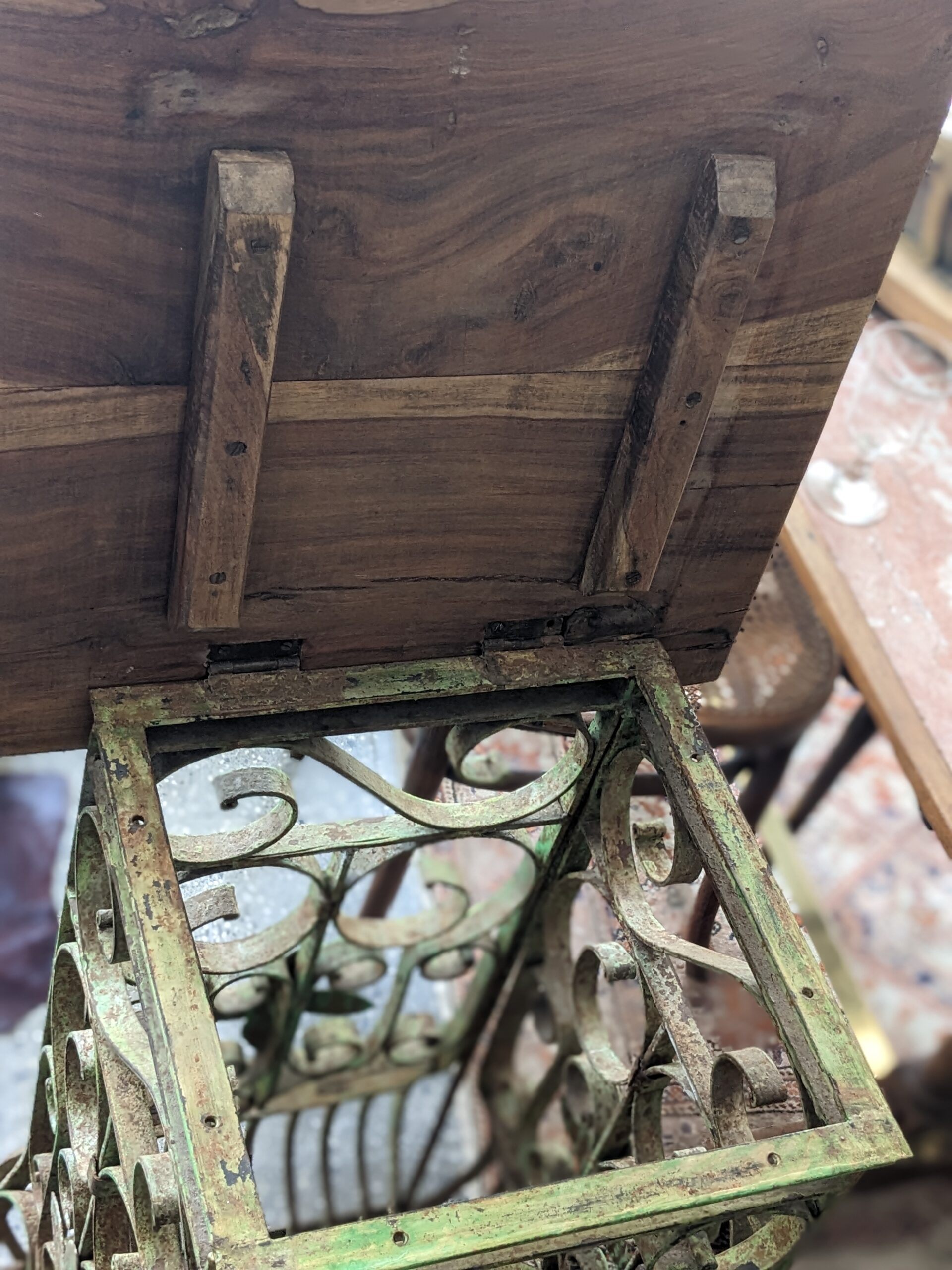 Imposante sellette en fer forgé début XXème avec plateau en bois formant couvercle